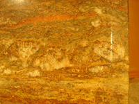 「城」の中央に位置するテーブルは、イタリア原産のレッドトラバーチンにしましたが、これも個々のテーブルによって模様の流れが異なるため、6点ある在庫の現物を全て見せてもらって、二人で一番気に入ったテーブルにしました。